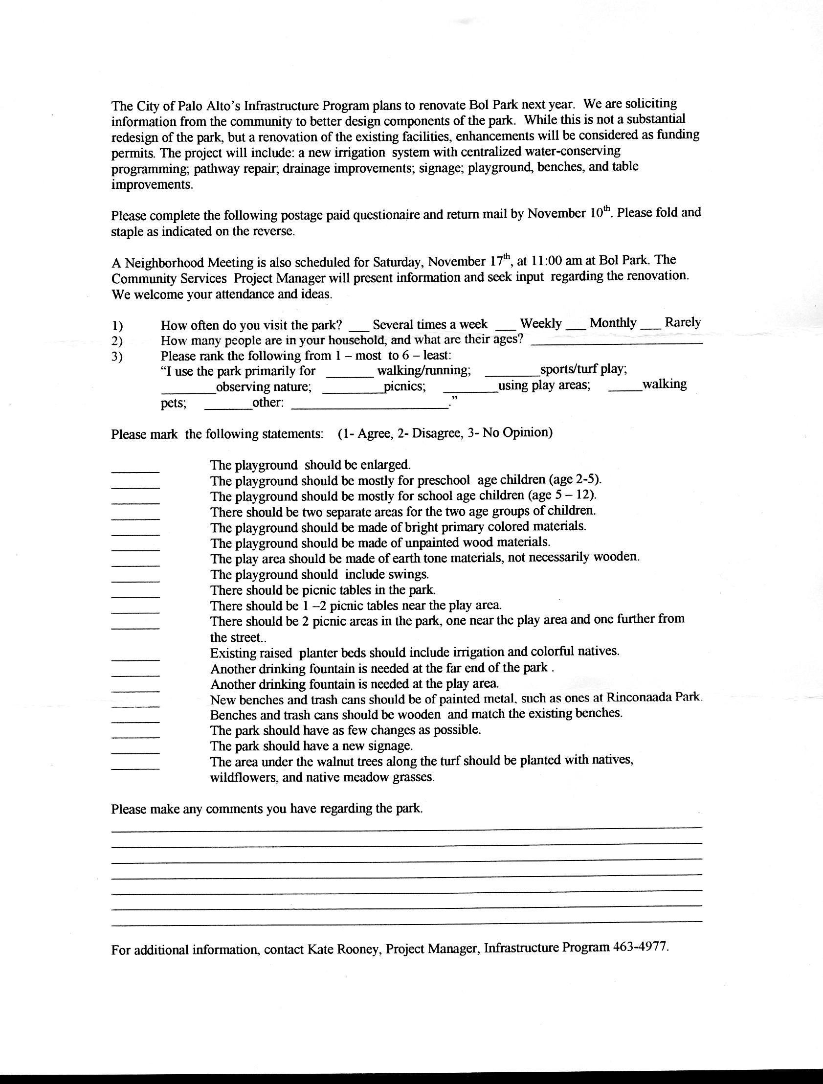 A Neighborhood Meeting is also scheduled for Saturday, November 17th, at 11:00 am at Bol Park. The Community Services Project Manager will present information and seek input regarding the renovation. We welcome your attendance and ideas.